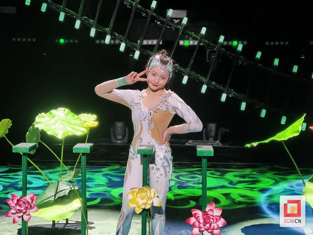 在演播厅舞台上,风摆动着荷叶随波荡漾,悠扬的旋律从远方而至,如诗如画、如梦如幻……《倒立技巧—荷塘月色》的表演者郭姚瑶在高高低低的荷叶上,以各种柔术和倒立造型动作来塑造蜻蜓的动静之态,时而有弯曲、伸展,有静止、有飞跃。