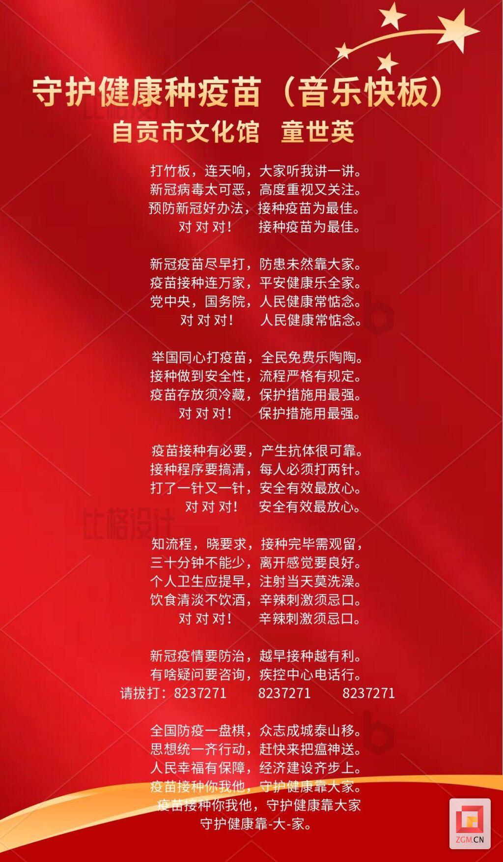 为了更好地宣传新冠疫苗接种知识,加强舆论引导,让新冠疫苗接种宣传更接地气,营造疫苗接种的良好氛围,进而形成共识,守护大众健康。近日,由自贡市文化馆馆长童世英创作的音乐快板《守护健康种疫苗》顺利录制完成,并与广大观众见面。
