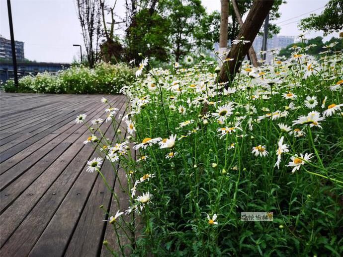 水涯居大桥旁的文创公园步道周边遍植滨菊,现在正值绽放的好时节。