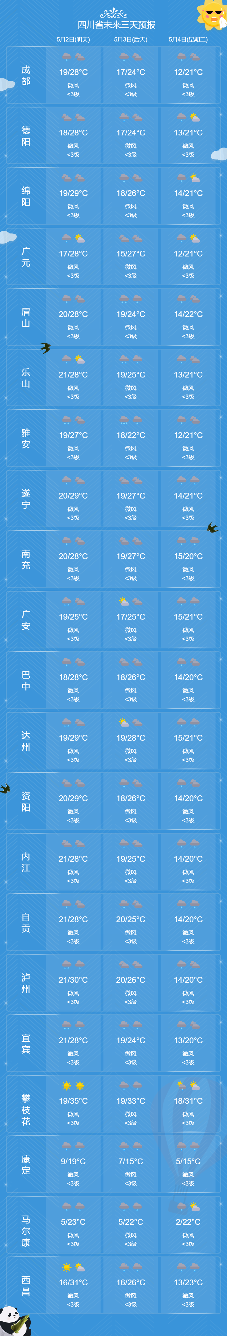 记者从四川省气象台获悉,今天晚上到明天白天:盆地各市多云转阴天有阵雨或雷雨,雷雨时伴有阵性大风,个别山区有冰雹,其中绵阳、广元、巴中、南充、遂宁5市部分地方有大雨,局地有暴雨,盆地其余地方有小到中雨;川西高原和攀西地区大部多云间阴天有阵雨。24小时内,盆地最低气温:19-22℃;最高气温:西部26-28℃,其余地方28-31℃。