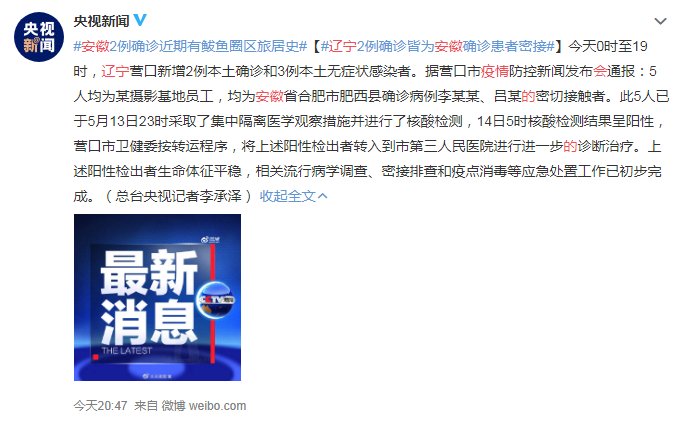 今天0时至19时,辽宁营口新增2例本土确诊和3例本土无症状感染者。据营口市疫情防控新闻发布会通报:5人均为某摄影基地员工,均为安徽省合肥市肥西县确诊病例李某某、吕某的密切接触者。此5人已于5月13日23时采取了集中隔离医学观察措施并进行了核酸检测,14日5时核酸检测结果呈阳性,营口市卫健委按转运程序,将上述阳性检出者转入到市第三人民医院进行进一步的诊断治疗。上述阳性检出者生命体征平稳,相关流行病学调查、密接排查和疫点消毒等应急处置工作已初步完成。