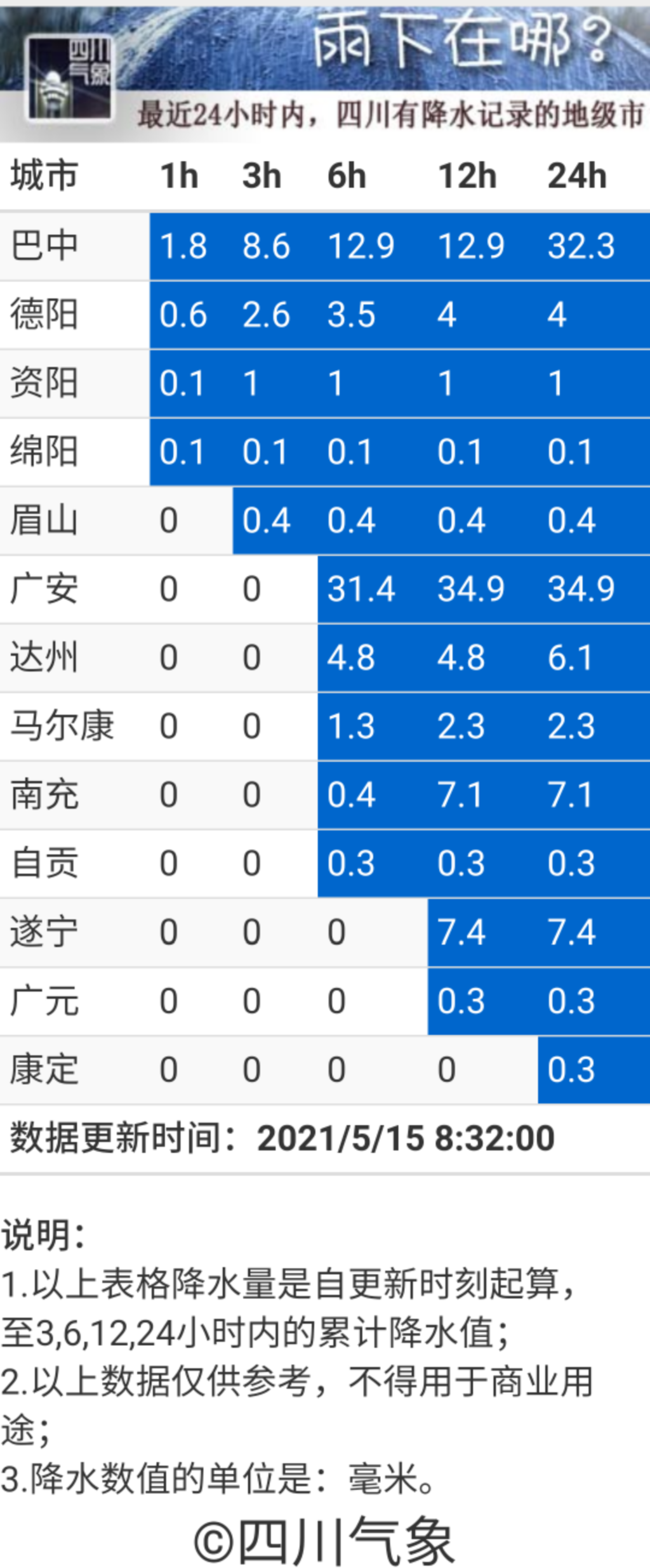 综合四川省气象台和各市州气象台的天气预报,总的说来,今、明两天晴多雨少,明天的天气好过今天,今天白天的雨水少于昨夜。