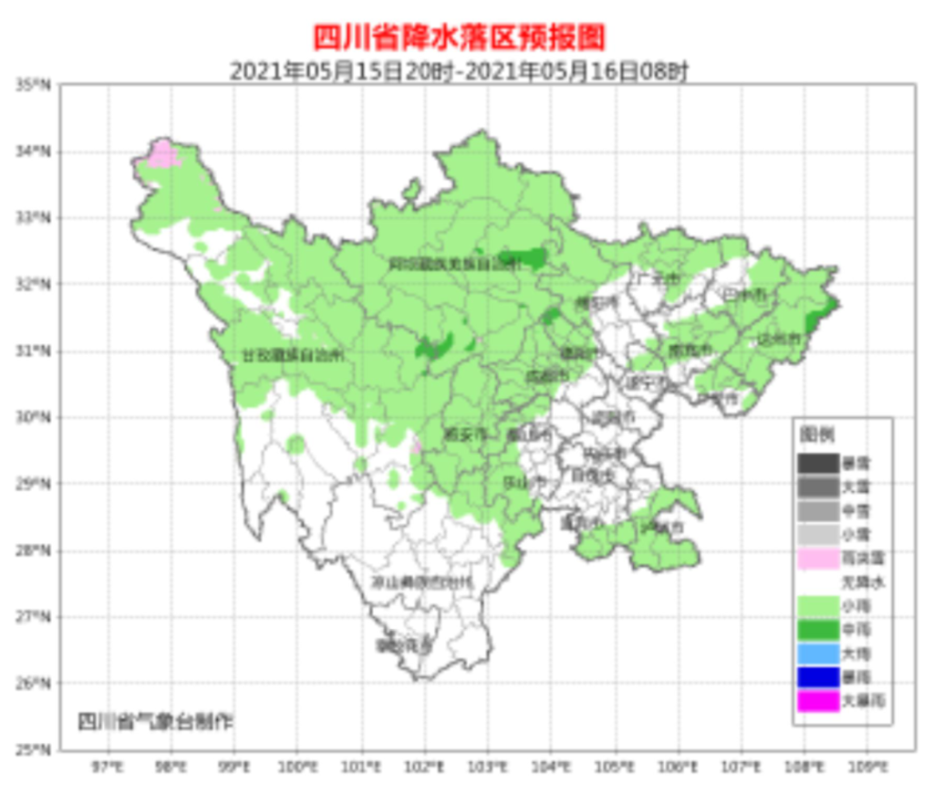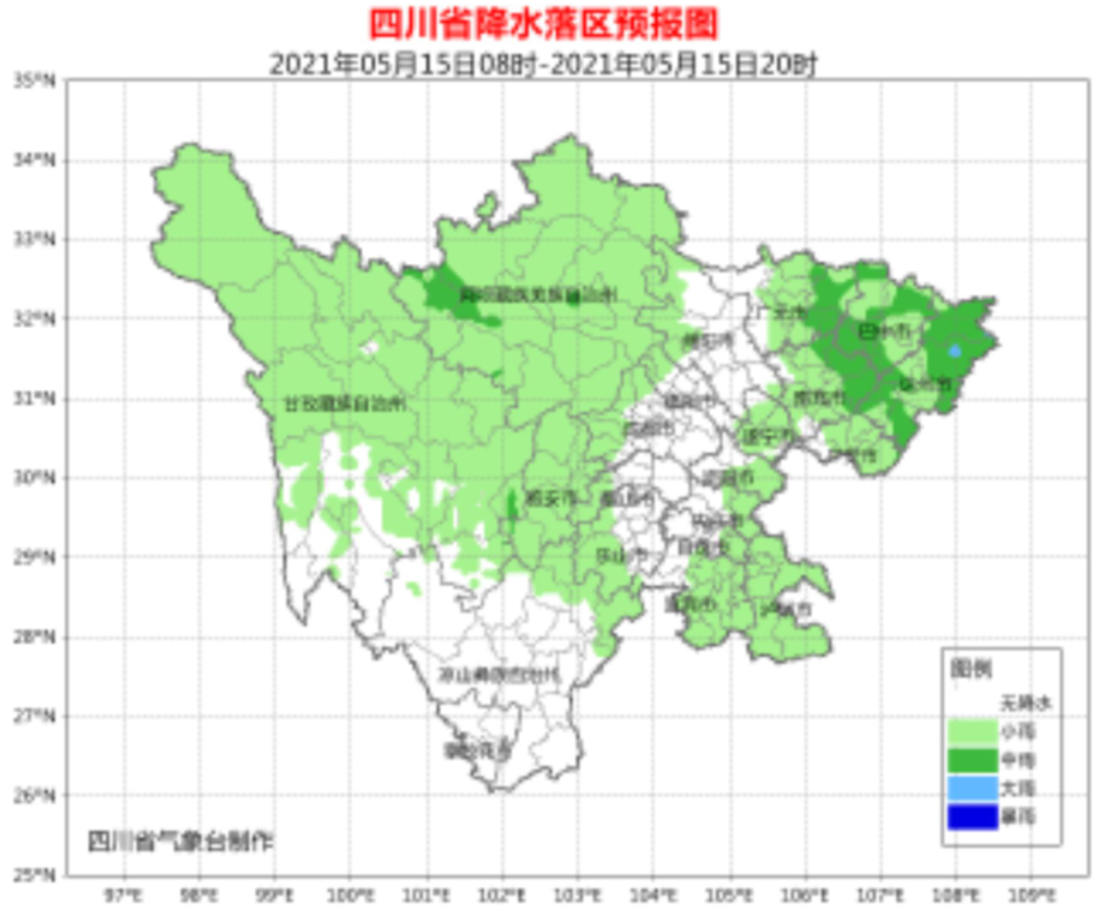 今天(5月15日)白天,盆地大部地方阵雨转多云,其中广元、巴中、达州、南充4市的部分地方有中雨,盆地普遍有4级左右偏北风,山口河谷地区风力可达6级或以上;川西高原阴天间多云有阵雨或雷雨,其中阿坝州局地有中雨;攀西地区以多云间晴天气为主,其中凉山州东北部阴天间多云有阵雨。