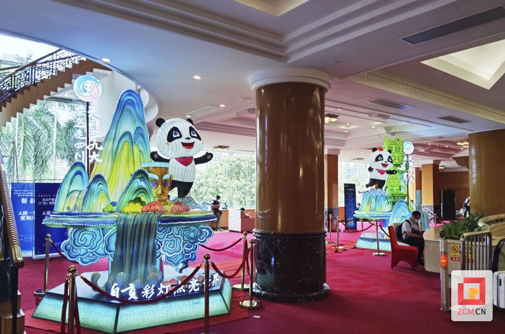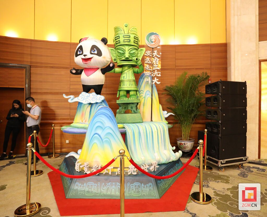 活动现场入口处设有特色“灯门”,会场内部摆放着两排长9米的宫灯墙,悬挂着66个灯笼,让人仿佛置身于自贡·中华彩灯大世界。全新设计灯组以四川文旅形象大使熊猫“安逸”为创作主体,融入“三星堆”特色元素,以“祥云流水”为点缀。此外,现场还展示了包括中华瓷龙、福灯、金雕、白孔雀、朝天吼等在内的彩灯文创产品,与震撼精美的大型灯组一起,全面诠释自贡彩灯产业发展的新高度。