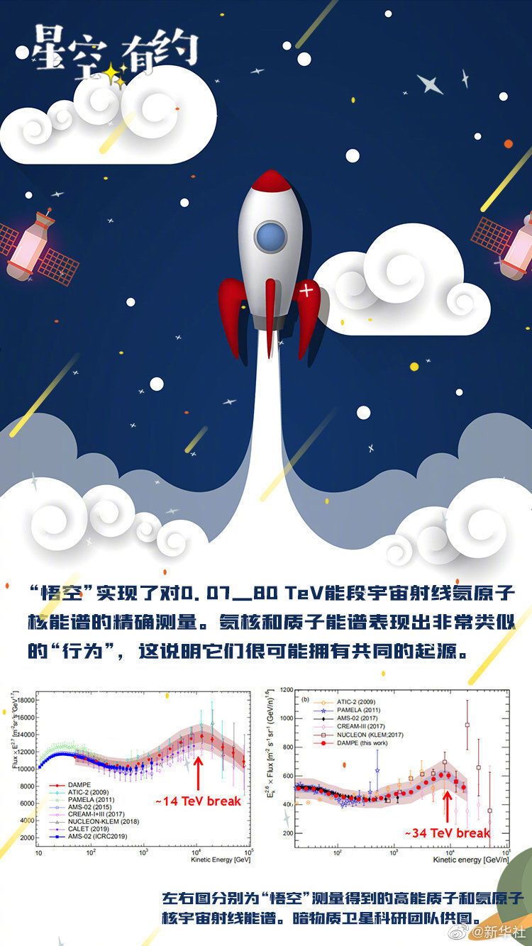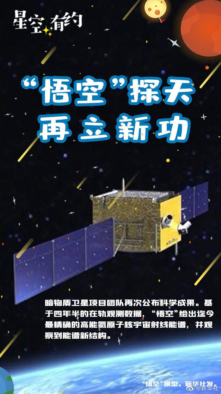 【暗物质卫星“悟空”发布第三批科学成果】中国暗物质卫星项目团队19日再次公布科学成果。基于四年半的在轨观测数据,“悟空”绘出迄今最精确的高能氦原子核宇宙射线能谱,并观察到能谱新结构。这一发现可能预示存在一处未知的宇宙射线源。