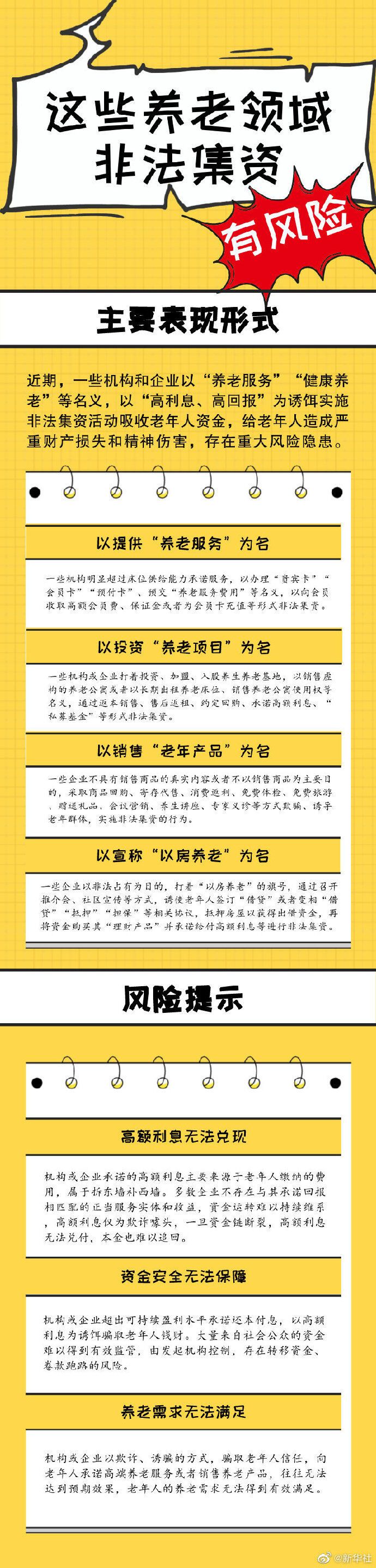 近期,一些机构和企业以“养老服务”“健康养老”等名义,以“高利息、高回报”为诱饵实施非法集资活动吸收老年人资金,给老年人造成严重财产损失和精神伤害。为此,全国老龄办、公安部、民政部和中国银保监会最新发布《关于养老领域非法集资的风险提示》,快喊咱爸妈一起戳图来看!↓↓↓