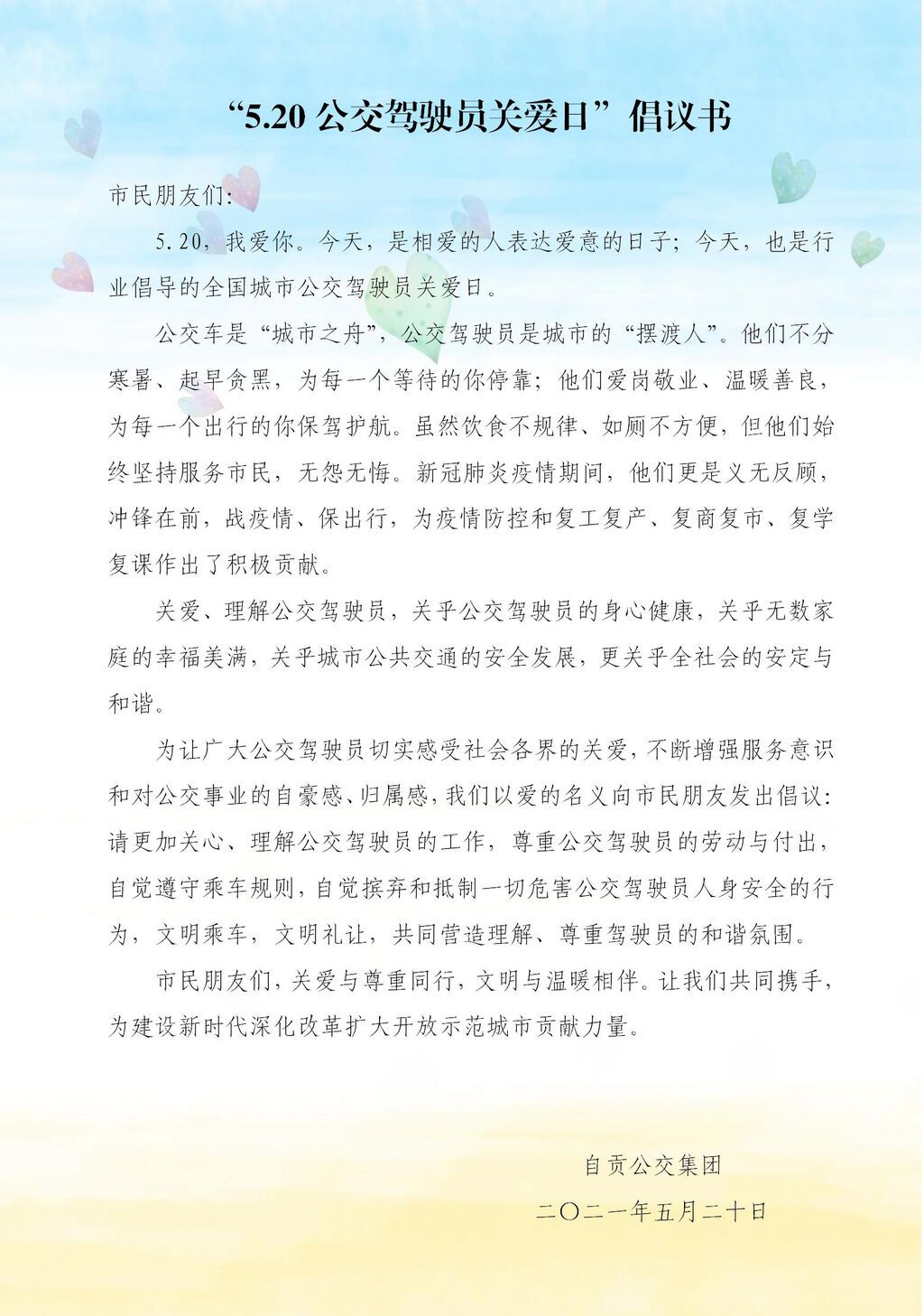5月20日是“公交驾驶员关爱日”,在这个格外有爱的日子,自贡公交集团为一线员工送出了各种“表白”:职业健康讲座、发出关爱倡议书、进行通报表扬、邀请家属座谈……