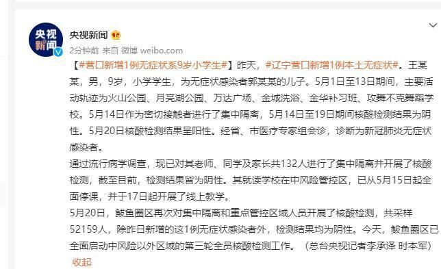 5月20日,辽宁营口新增1例本土无症状。王某某,男,9岁,小学学生,为无症状感染者郭某某的儿子。5月1日至13日期间,主要活动轨迹为火山公园、月亮湖公园、万达广场、金城洗浴、金华补习班、攻舞不克舞蹈学校。5月14日作为密切接触者进行了集中隔离,5月14日至19日期间核酸检测结果为阴性。5月20日核酸检测结果呈阳性。经省、市医疗专家组会诊,诊断为新冠肺炎无症状感染者。