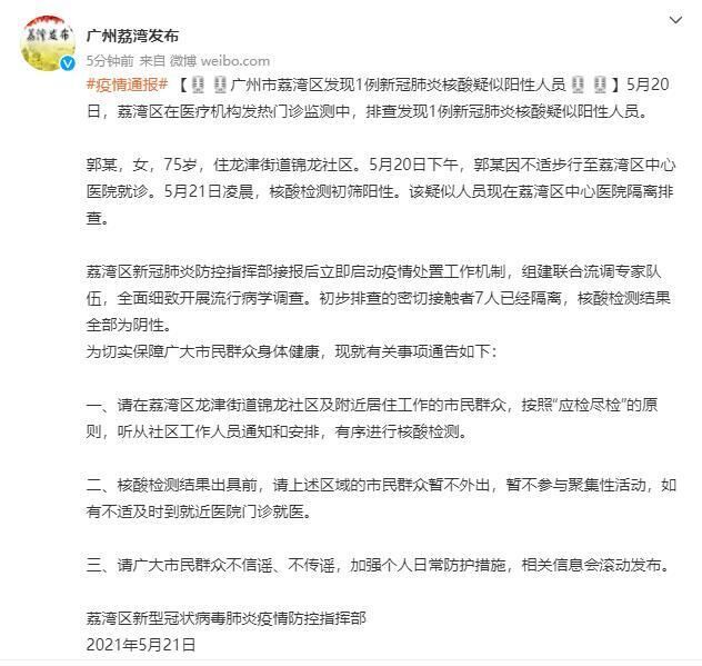 5月20日,荔湾区在医疗机构发热门诊监测中,排查发现1例新冠肺炎核酸疑似阳性人员。