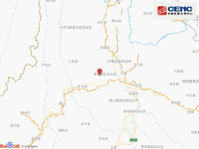 中国地震台网正式测定:05月21日21时56分在云南大理州漾濞县(北纬25.64度,东经99.95度)发生4.9级地震,震源深度8千米。