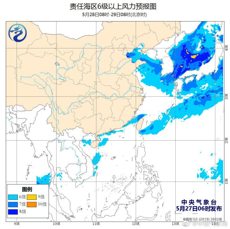 5月27日白天至夜间,渤海、渤海海峡、黄海北部海域、辽东半岛沿岸海域、山东半岛沿岸海域、渤海湾、莱州湾、浙江及福建沿岸海域、雷州半岛西部沿岸海域、广西东部沿岸海域将有8~10级的雷暴大风,其中部分海域风力可达11~12级。