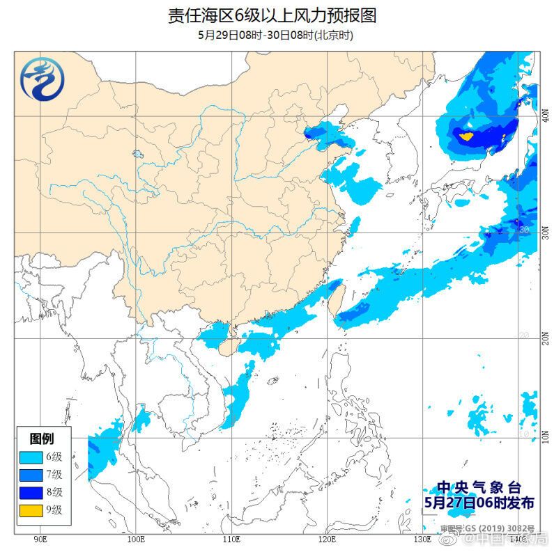 5月27日白天至29日夜间,渤海海峡、黄海大部海域、台湾海峡、台湾以东洋面将有6~7级、阵风8级的偏南风或西南风。27日白天,东海东北部海域将有6~7级、阵风8~9级西南风。