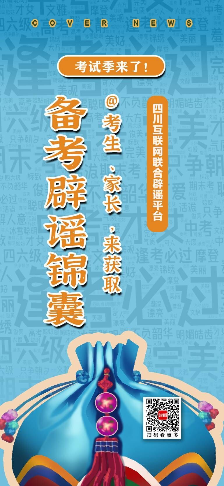 别担心,为营造良好考试氛围,6月至8月中旬,由中共四川省委网信办主管,四川省网络治理研究中心主办,封面新闻承办的四川互联网联合辟谣平台,将联合全省各大新媒体网站、市县融媒体中心,推出“备考辟谣锦囊、涉考谣言可休矣”主题宣传活动,揭露涉考谣言、破除扰人骗局、消除考生家长疑虑。