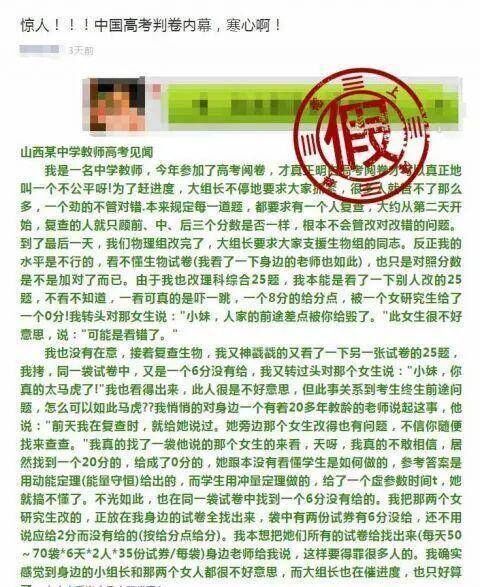 这也是高考老谣言了,每年高考成绩公布前后,总有人炒作某地高考阅卷工作极不严肃,阅卷教师甚至不管对错,乱打分。事实证明,发布这些帖子的人往往是为博取关注,还有的是部分高考成绩落差较大或考试不理想的考生和家长武断地认为是阅卷出了问题,胡乱猜测。