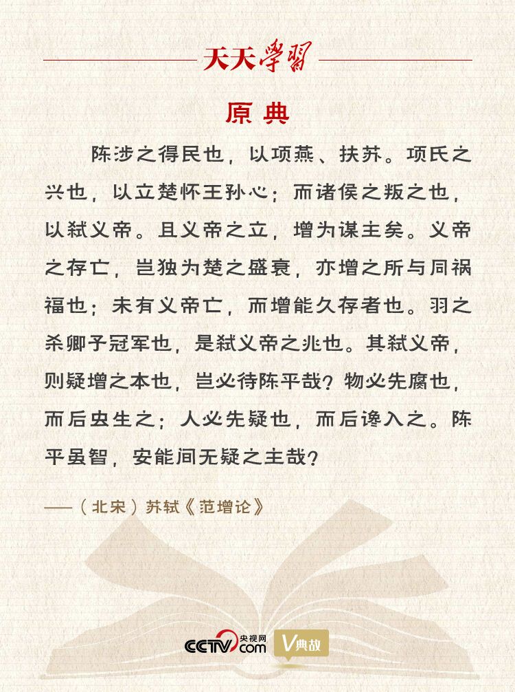 《范增论》是苏轼早期的一篇史论文章,收录在《古文观止》卷十。文中苏轼针对陈平用计离间项羽和范增的观点,翻空出奇,立意新颖地提出:“物必先腐也,而后虫生之;人必先疑也,而后谗入之。”作者打了个比方,东西总是自身先腐烂,然后虫子才会寄生,说明事物总是自己先有弱点然后才为外物所侵。指出正是由于项羽生性多疑,听信谗言,才被敌人利用,从而招致惨败。