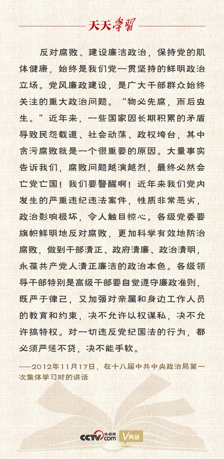 党风廉政建设永远在路上,反腐败斗争永远在路上。当前,反腐败斗争虽然取得了压倒性胜利并不断巩固发展,但形势依然严峻复杂。腐败问题具有顽固性、反复性、长期性,我们必须坚持把反腐败斗争摆在极为重要的位置,才能经受住“四大考验”、克服“四种危险”。只要坚持管党治党不放松、正风肃纪不停步、反腐惩恶不手软,我们就一定能够跳出治乱兴衰的历史周期率,赢得这场输不起也决不能输的政治斗争,引领和保障中国特色社会主义巨轮行稳致远!
