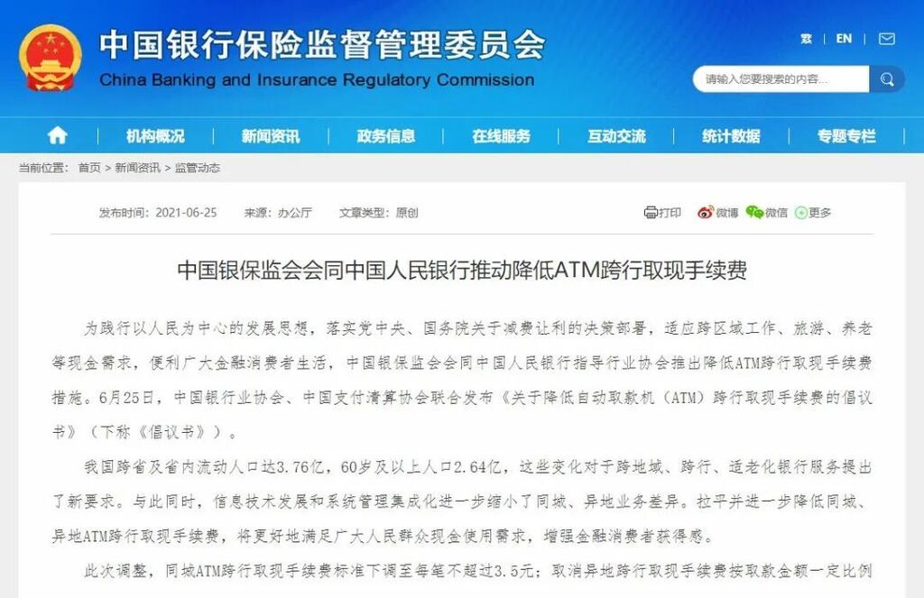 为践行以人民为中心的发展思想,落实党中央、国务院关于减费让利的决策部署,适应跨区域工作、旅游、养老等现金需求,便利广大金融消费者生活,中国银保监会会同中国人民银行指导行业协会推出降低ATM跨行取现手续费措施。6月25日,中国银行业协会、中国支付清算协会联合发布《关于降低自动取款机(ATM)跨行取现手续费的倡议书》(下称《倡议书》)。