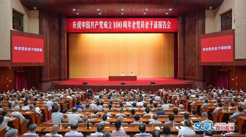 喜迎党的百年华诞,锦江大礼堂洋溢着热烈喜庆的节日气氛。大礼堂上方,悬挂写有“热烈庆祝中国共产党成立100周年”大红横幅,广场两侧是一幅幅反映中国共产党四川历史大事件的照片。老党员老干部沿着红毯拾级而上走进大厅,“向为四川经济社会发展作出重要贡献的老党员老干部致敬”的标语醒目而庄重。