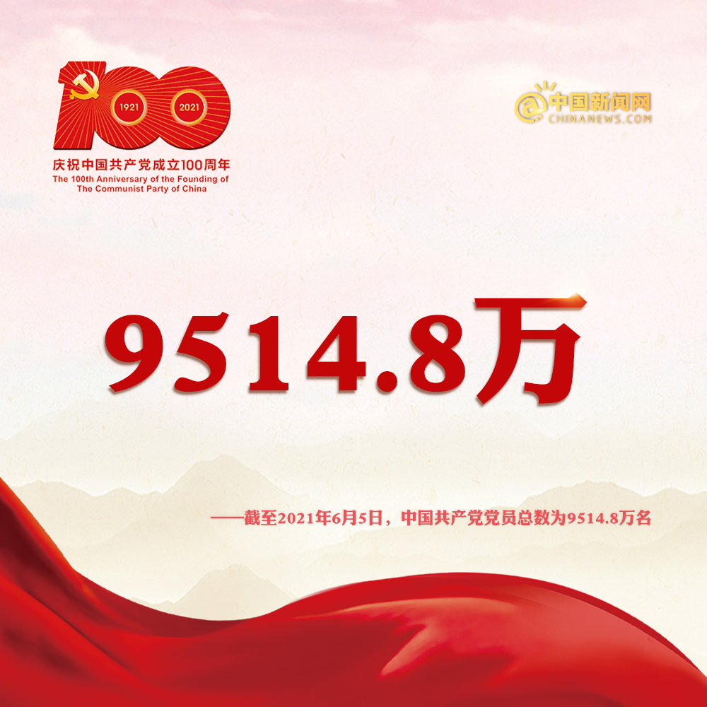 截至2021年6月5日,中国共产党党员总数为9514.8万名,比2019年底净增323.4万名,增幅为3.5%。