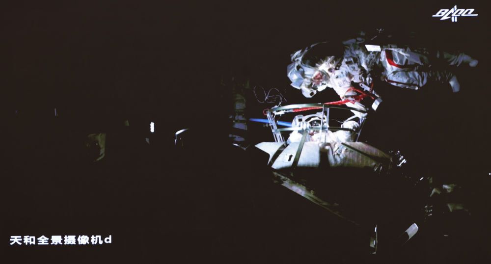 ↑7月4日,在北京航天飞行控制中心大屏拍摄的航天员刘伯明在舱外工作场面。