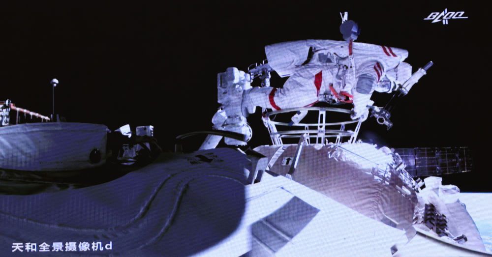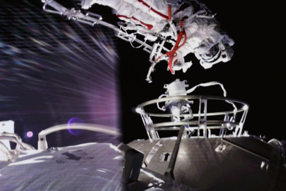 据中国载人航天工程办公室消息,北京时间2021年7月4日8时11分,神舟十二号乘组航天员刘伯明成功开启天和核心舱节点舱出舱舱门,截至11时02分,航天员刘伯明、汤洪波身着中国自主研制的新一代“飞天”舱外航天服,已先后从天和核心舱节点舱成功出舱,并已完成在机械臂上安装脚限位器和舱外工作台等工作,后续将在机械臂支持下,相互配合开展空间站舱外有关设备组装等作业。期间,在舱内的航天员聂海胜配合支持两名出舱航天员开展舱外操作。 (新华社记者 金立旺 摄影报道)