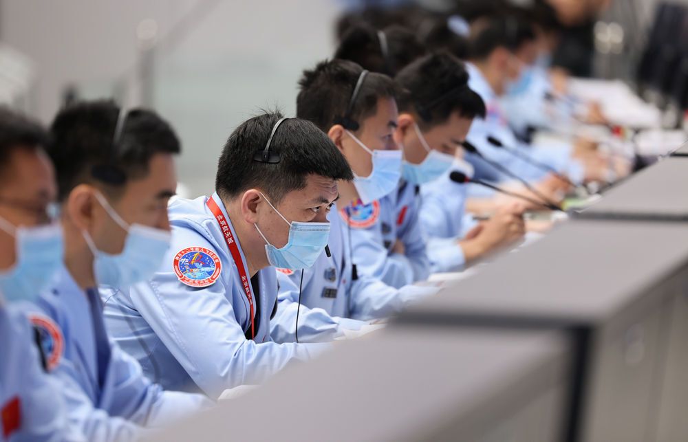 ↑7月4日,在北京航天飞行控制中心,航天科研人员在紧张工作。