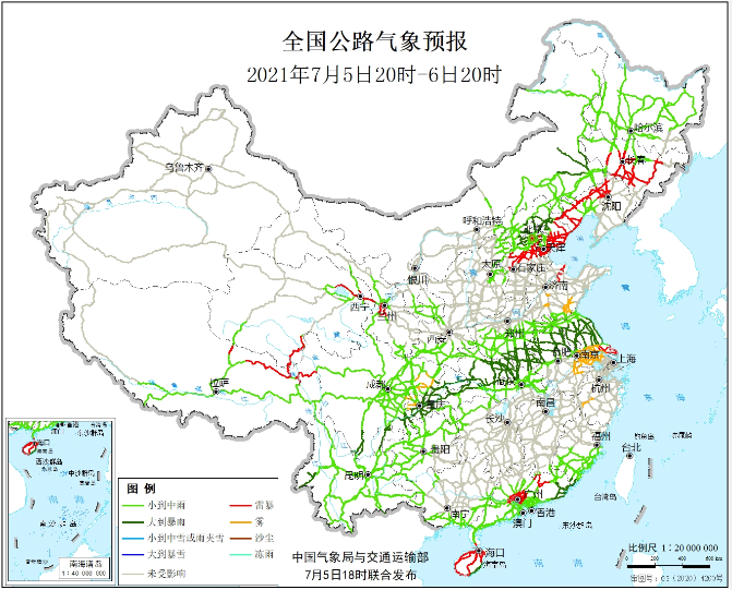 中国气象局与交通运输部7月5日联合发布全国主要公路气象预报:7月5日20时至6日20时,内蒙古东南部、河北北部、北京西部和北部、湖北中北部、河南东南部、安徽中北部、江苏中北部、四川东部和南部、重庆中北部、华南东部、海南岛东南部等地有大到暴雨,其中,湖北西部、河南东南部、安徽北部、江苏西北部等地的部分地区有大暴雨。上述部分地区伴有短时强降水,局地有雷暴大风等强对流天气。另外,山东南部、江苏南部、安徽东部、浙江西部、四川东北部、重庆西南部等地局地有雾。