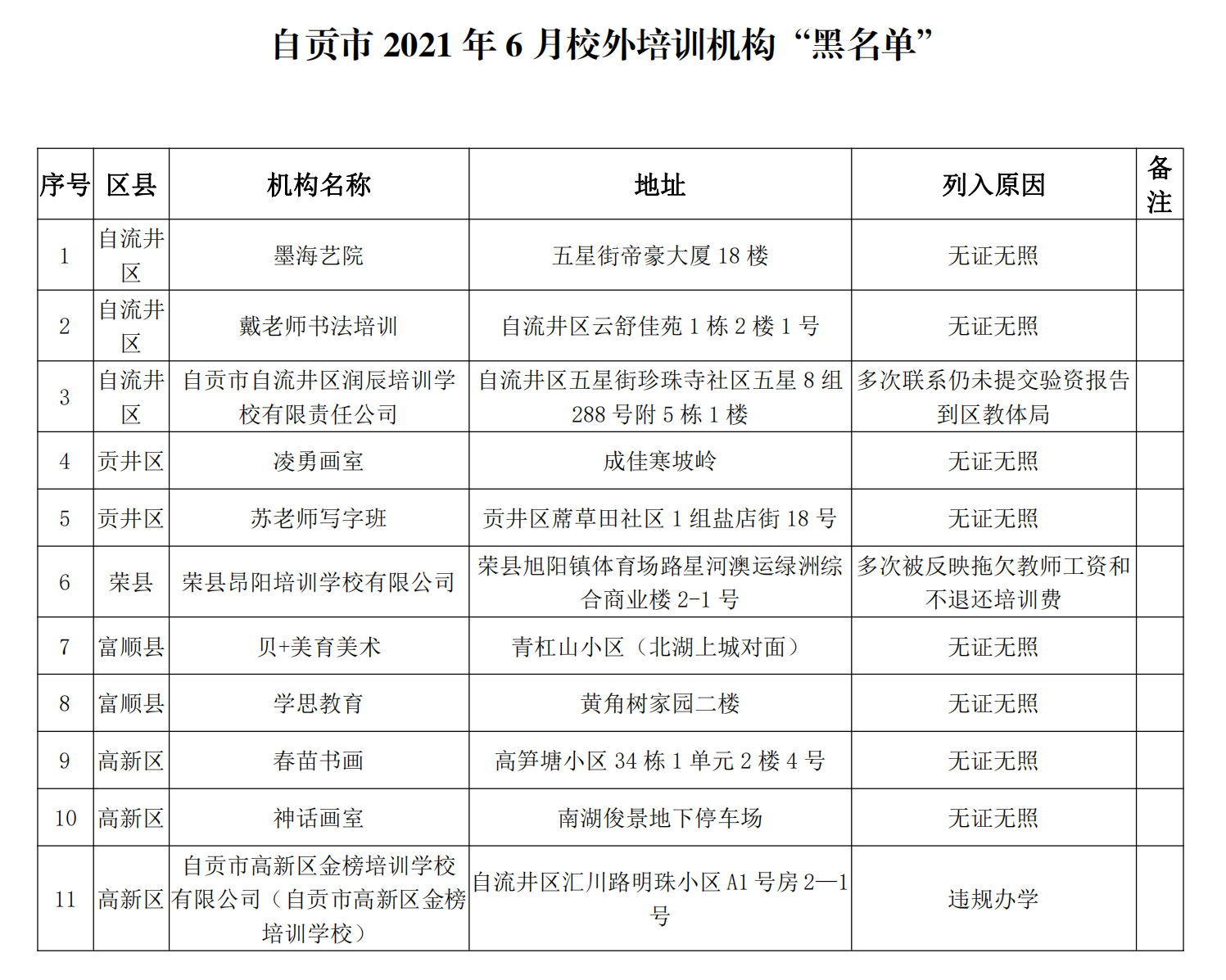 截至2021年6月自贡市校外培训机构“黑名单”