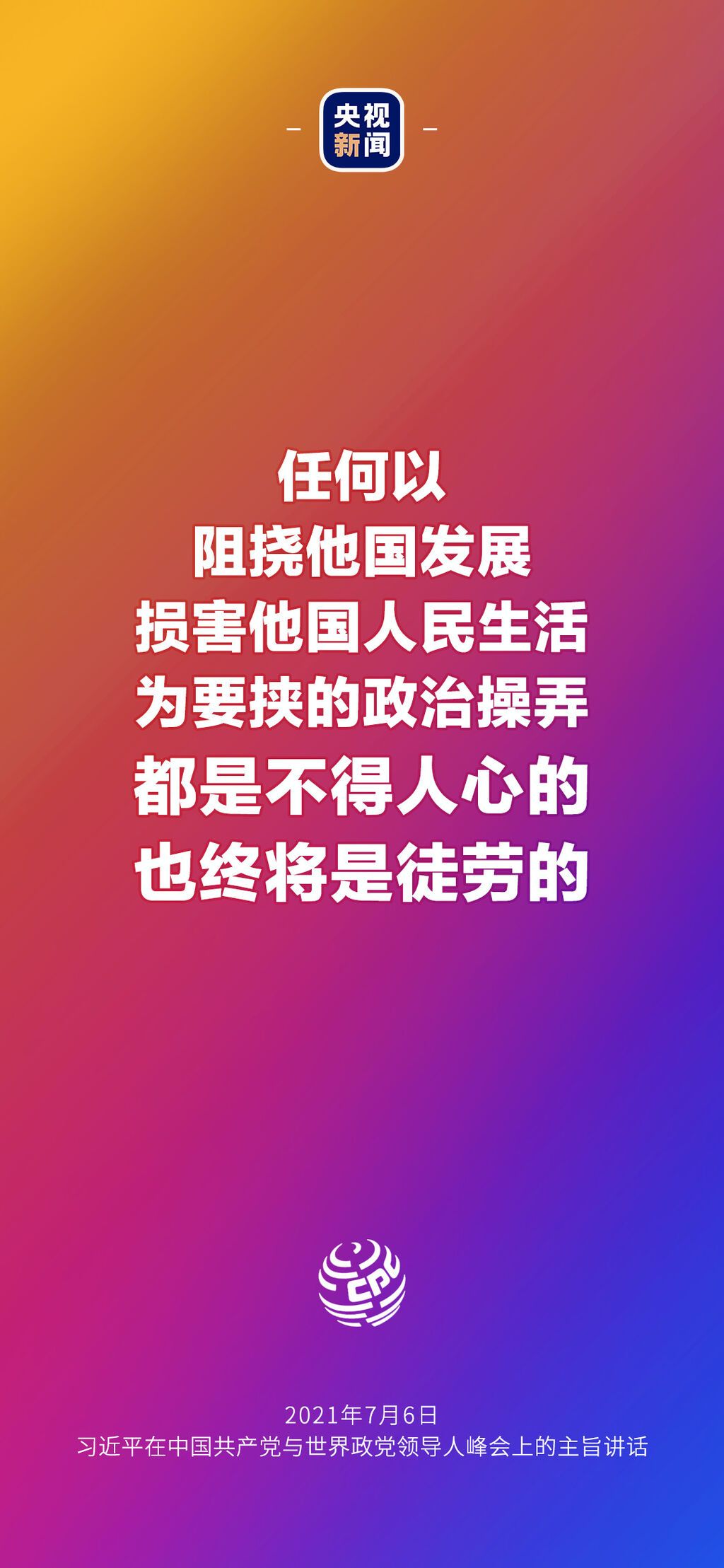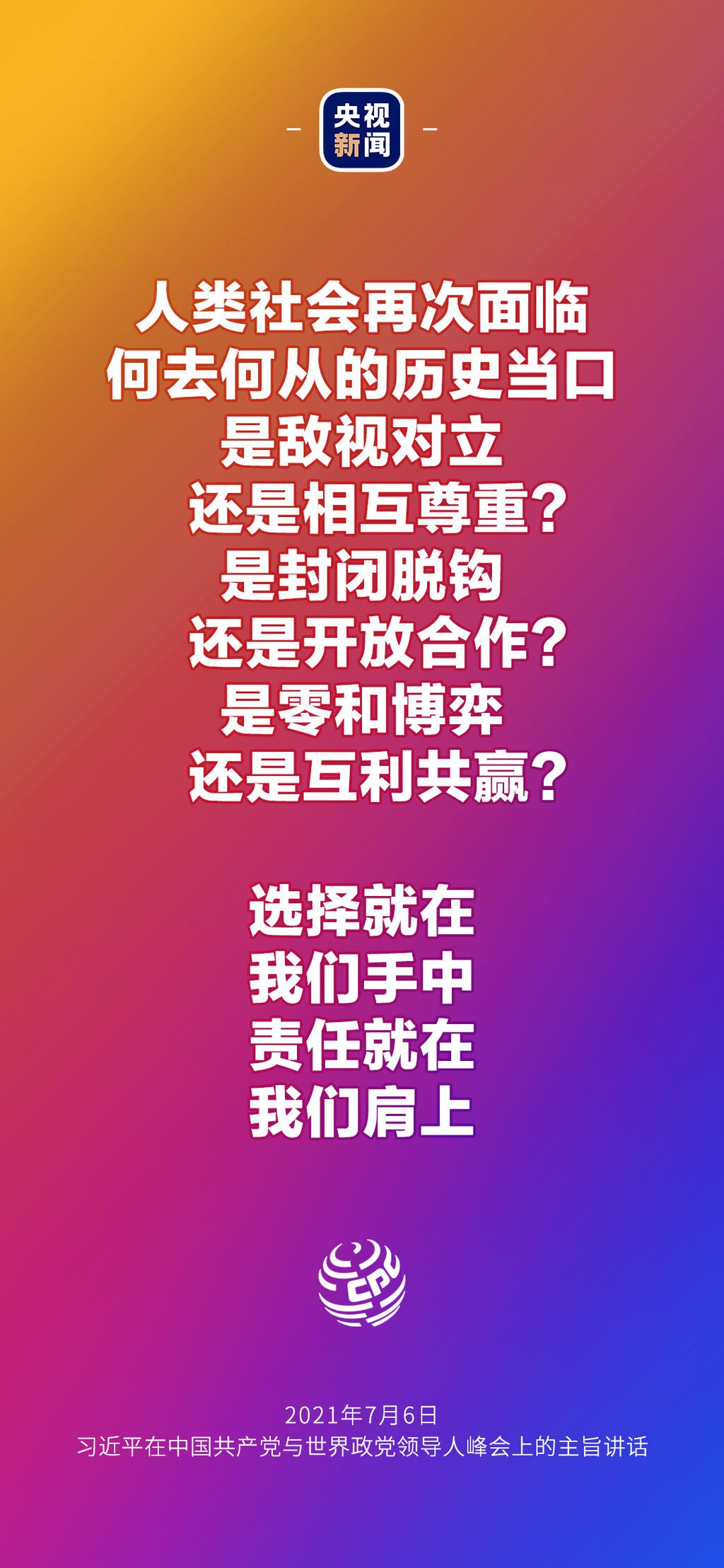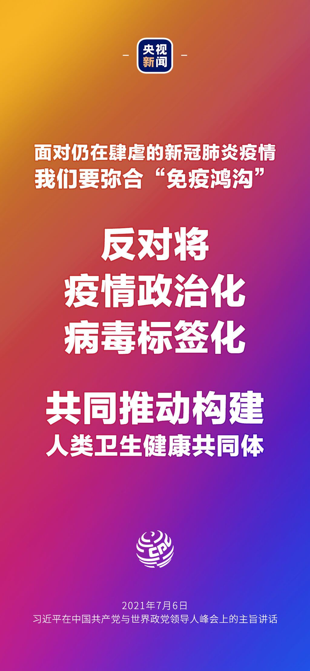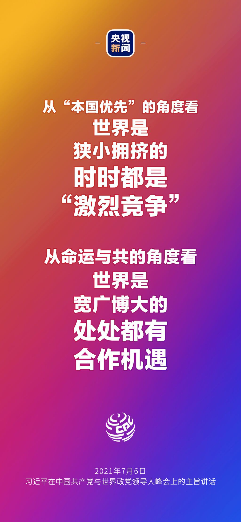 7月6日晚,中国共产党与世界政党领导人峰会以视频连线方式举行,160多个国家的500多个政党和政治组织的领导人以及逾万名政党代表出席了会议。中共中央总书记、国家主席习近平在北京出席会议并发表主旨讲话,讲话向世界传递了哪些中国声音?看梳理→