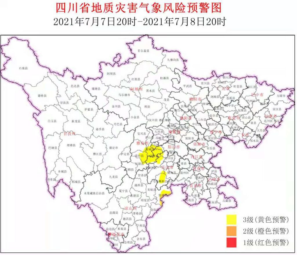 7月7日,四川省地质灾害指挥部办公室结合四川省气象台天气预报情况,发布地灾黄色预警:7月7日20时至7月8日20时,雅安、眉山、乐山、凉山四个市州的15个县(市、区)进入预警范围,这是我省连续第三天发布地灾黄色预警。