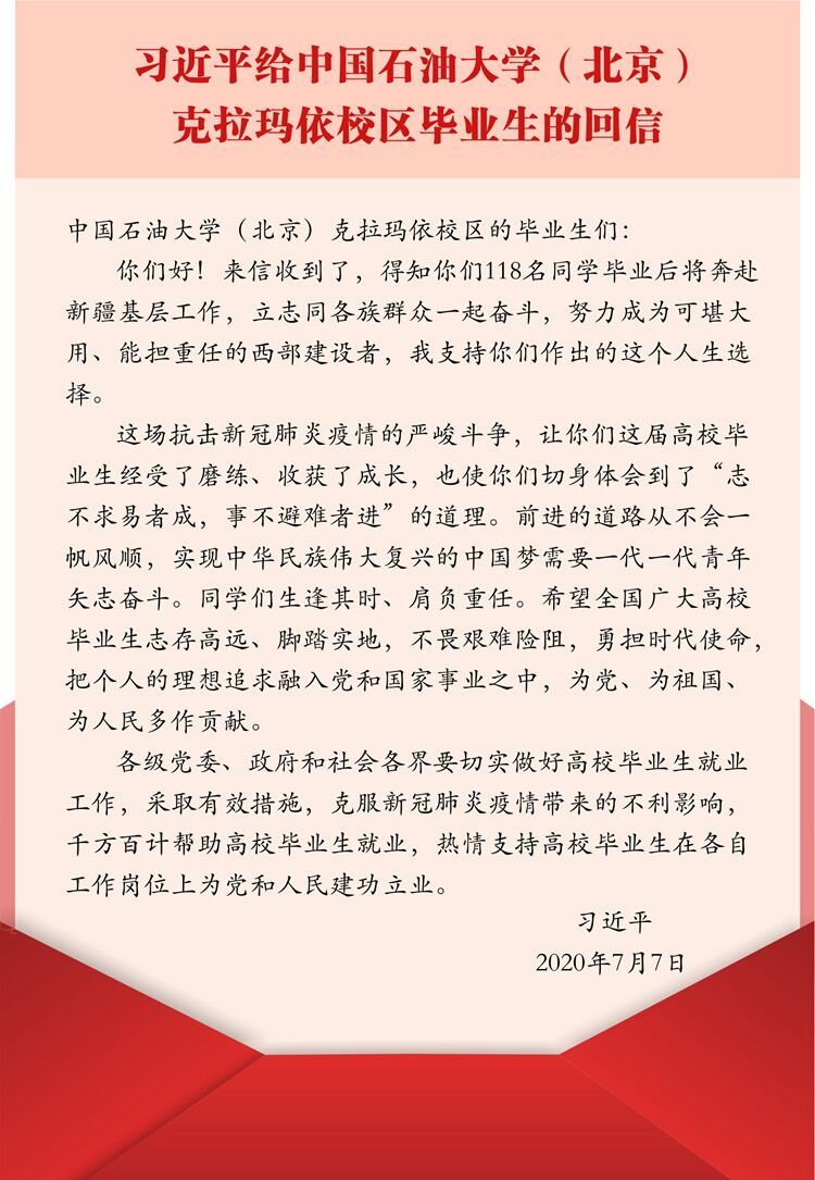 中国石油大学(北京)克拉玛依校区2016年开始招生,435名首届毕业生来自全国16个省份,其中118人选择到新疆基层工作。去年毕业前夕,这118名毕业生给习近平总书记写信,表达了扎根西部、建设边疆的坚强决心。2020年7月7日,总书记给中国石油大学(北京)克拉玛依校区毕业生回信,肯定他们到边疆基层工作的选择,对广大高校毕业生提出殷切期望。