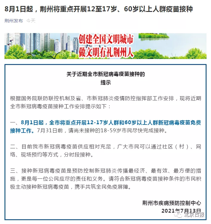 提示中提到,8月1日起,荆州市将重点开展12-17岁人群和60岁以上人群新冠病毒疫苗免费接种工作。7月31日前,请尚未接种的18-59岁市民尽快完成接种。