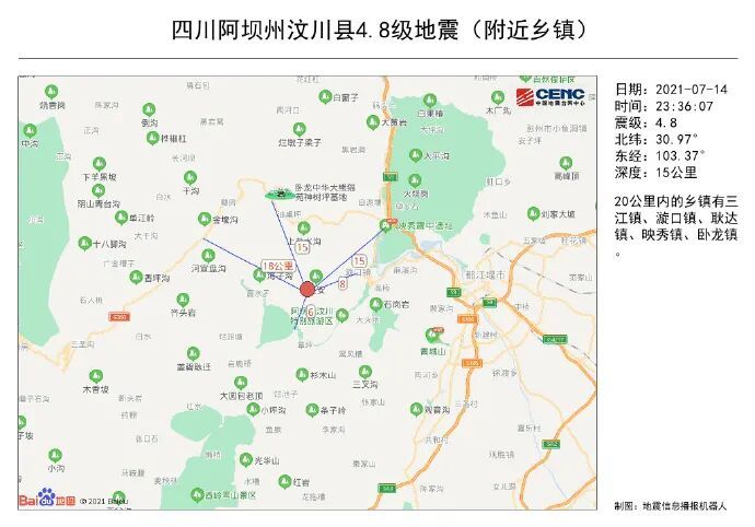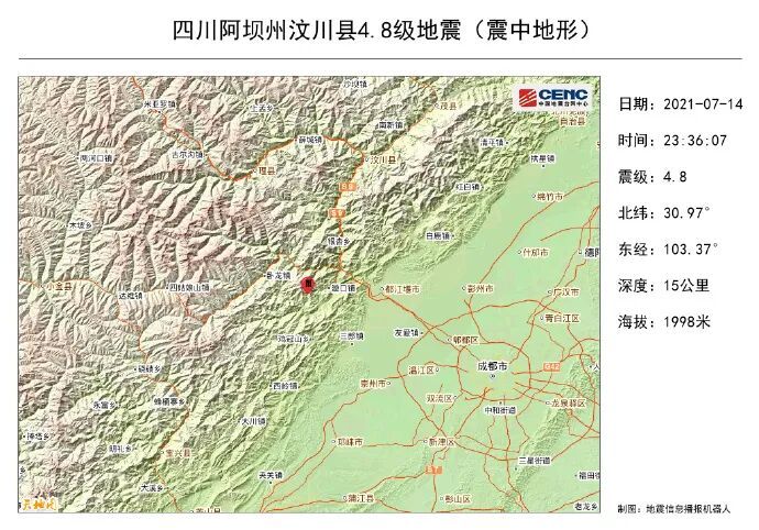 中国地震台网正式测定:07月14日23时36分在四川阿坝州汶川县(北纬30.97度,东经103.37度)发生4.8级地震,震源深度15千米。