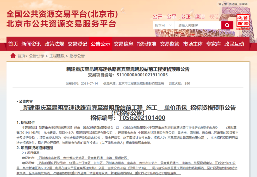 据京昆高速铁路西昆有限公司7月14日发布的《新建重庆至昆明高速铁路宜宾至嵩明段站前工程施工(单价承包)招标资格预审公告》显示,渝昆高铁宜宾至嵩明段计划2021年9月1日开工,2027年8月31日竣工,工期6年。