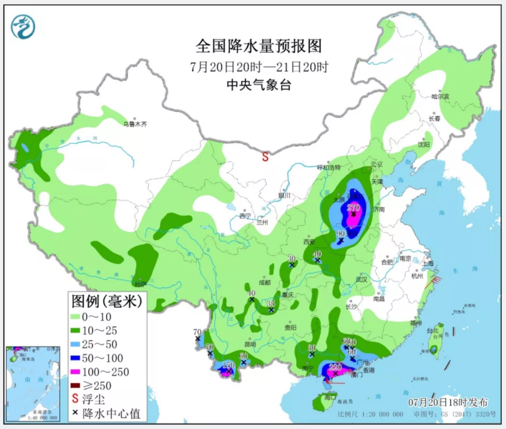 中央气象台20日18时继续发布暴雨橙色预警,预计20日20时至21日20时,河南中北部、河北南部、山西东南部以及广东中西部沿海、广西东南部、云南南部等地的部分地区有暴雨到大暴雨,其中河南北部局地有特大暴雨,上述部分地区伴有短时强降水,局地有雷暴大风等强对流天气。