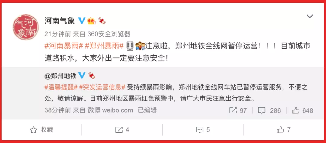 20日19时许,@郑州地铁 发布消息,受持续暴雨影响,郑州地铁全线网车站已暂停运营服务。