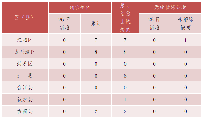 泸州市各区(县)确诊病例及无症状感染者情况表(截至2021年7月26日24时)