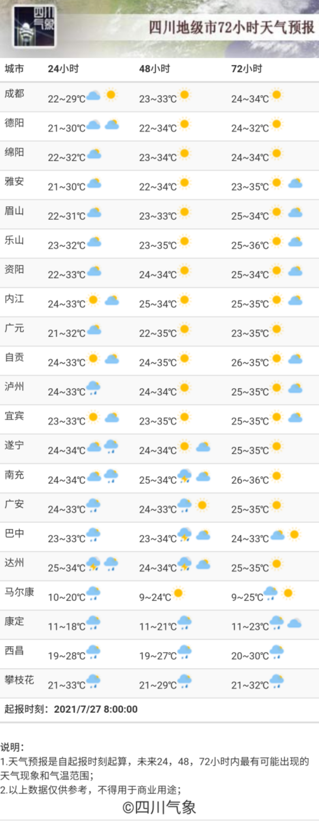 四川省气象台预计,72小时内,各主要城市的天气状况: