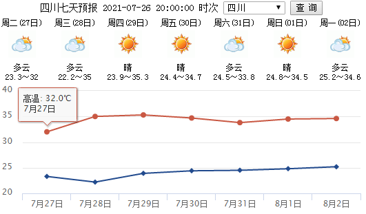 四川省气象台预计:从28日开始,“高温日+分散阵雨”的天气模式将逐渐占据四川天气的主导,盆地部分地方将会出现5天左右35℃以上高温天气。