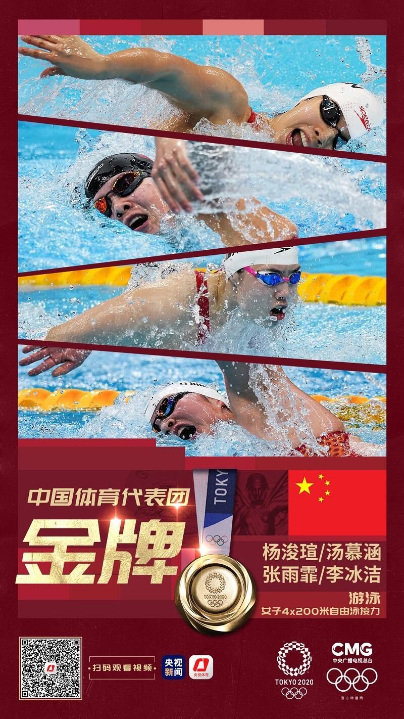 7月29日,东京奥运会游泳女子4x200米自由泳接力决赛中,中国选手杨浚瑄、汤慕涵、张雨霏、李冰洁以7分40秒33的成绩夺得金牌,并创造了新的世界纪录。