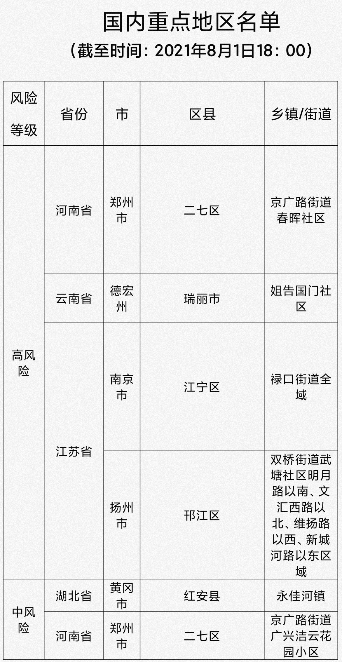@自贡人:看仔细——截至8月1日18时国内疫情风险等级为高、中风险地区名单