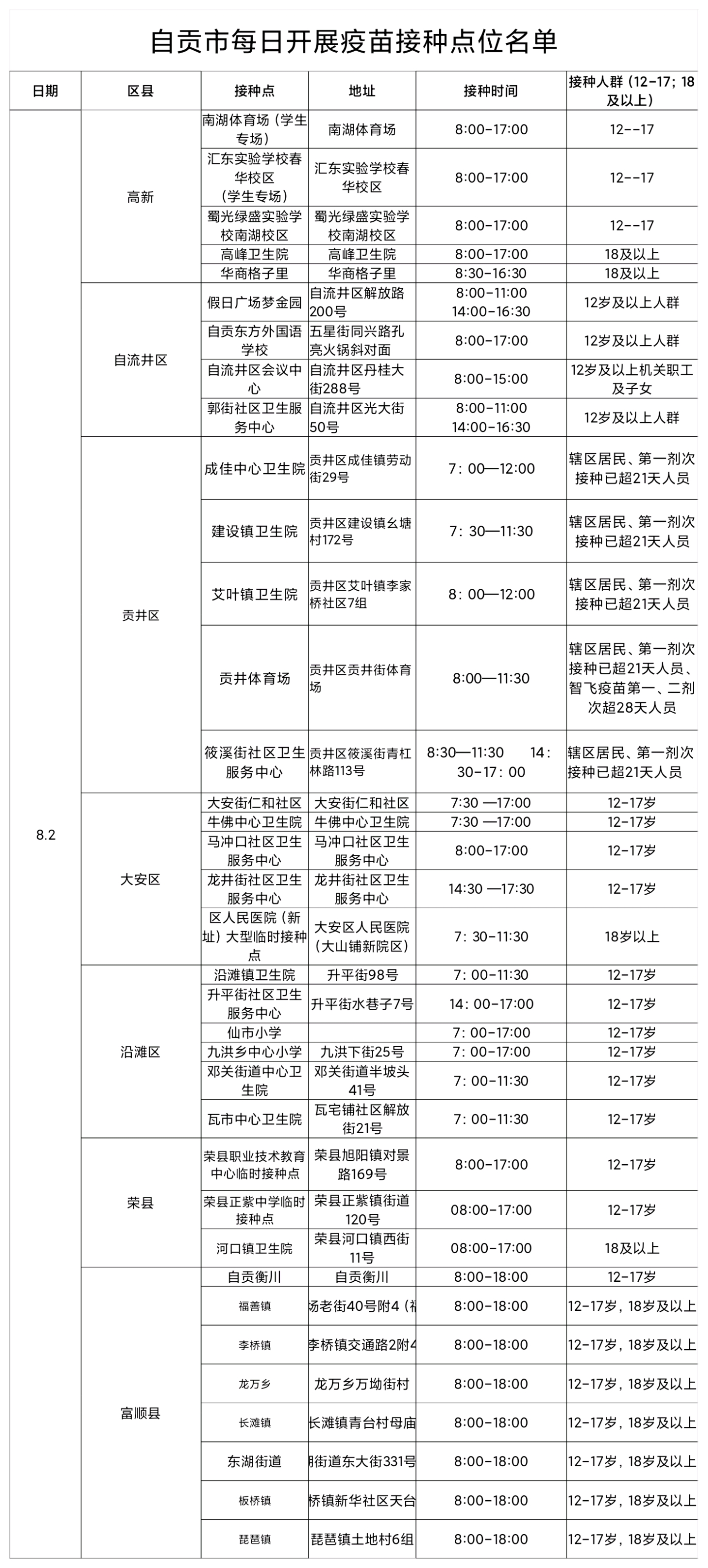 8月2日 自贡疫苗接种点位名单——