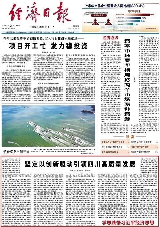 8月2日出版的《经济日报》在“学思践悟习近平经济思想”专栏中,发表了中共四川省委书记彭清华的署名文章《坚定以创新驱动引领四川高质量发展》,四川在线予以转载。