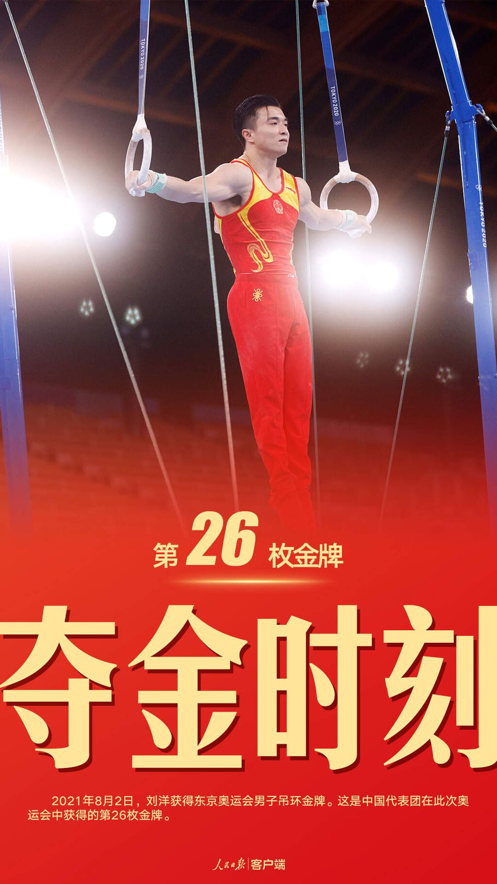 2021年8月2日,刘洋获得东京奥运会竞技体操男子吊环金牌,另一名中国选手尤浩获得银牌。这是中国代表团在此次奥运会中获得的第26枚金牌。