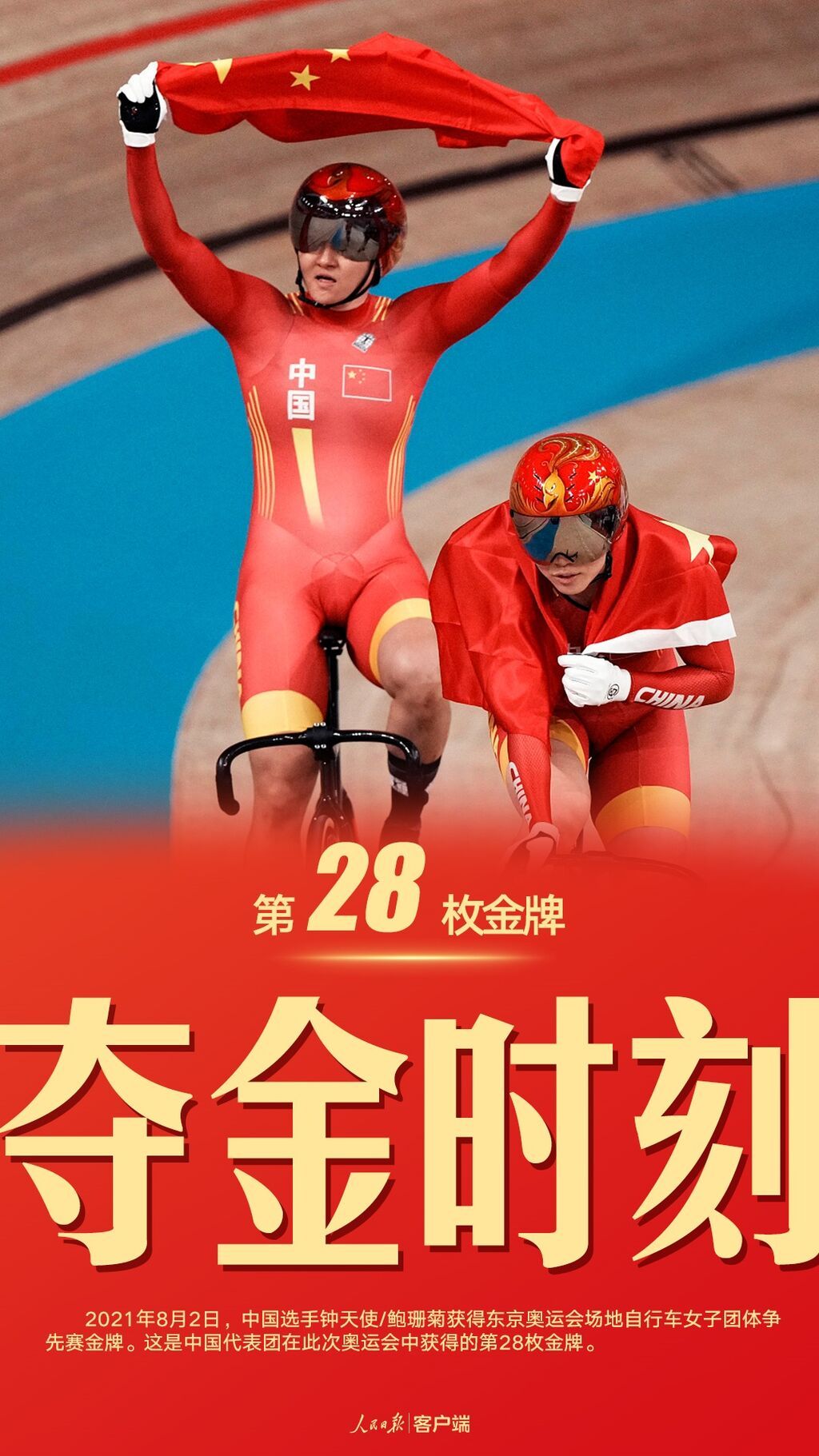 2021年8月2日,中国选手钟天使/鲍珊菊击败德国组合,获得东京奥运会场地自行车女子团体争先赛金牌。这是中国代表团在此次奥运会中获得的第28枚金牌。