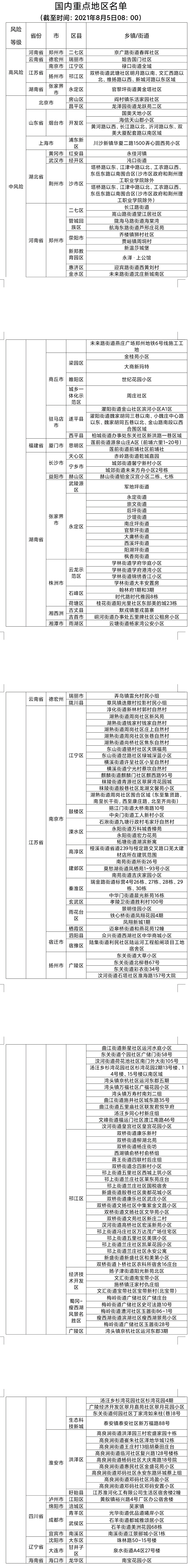 截至2021年8月5日08:00时,全国高风险地区5个,中风险地区 160个。