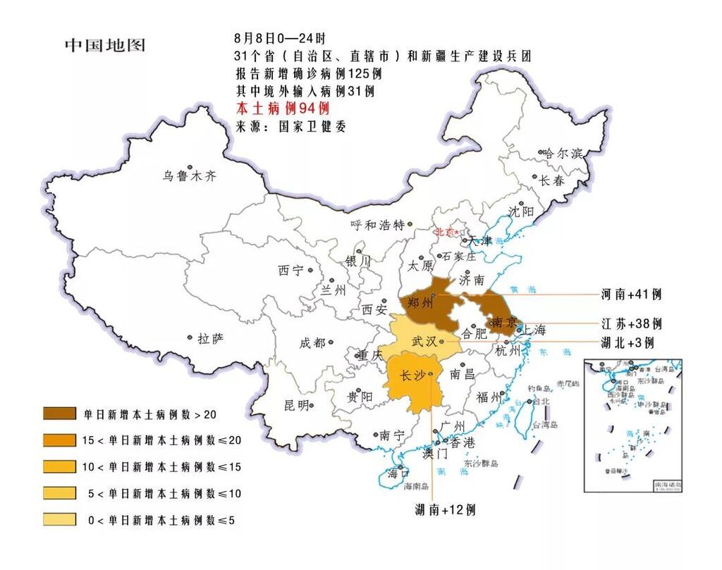 8月8日0—24时,31个省(自治区、直辖市)和新疆生产建设兵团报告新增确诊病例125例,其中境外输入病例31例(上海8例,广东8例,云南8例,北京3例,内蒙古1例,浙江1例,四川1例,陕西1例),本土病例94例(河南41例,江苏38例,湖南12例,湖北3例);无新增死亡病例;无新增疑似病例。