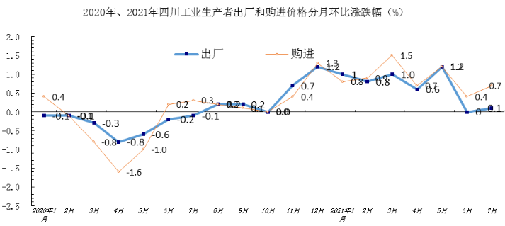 2021年7月份,四川工业生产者出厂价格指数(PPI,下同)同比上涨6.5%,涨幅比上月扩大0.1个百分点,涨幅创43个月新高;环比上涨0.1%,与上月相比由平转涨,重回上涨区间。工业生产者购进价格指数(IPI,下同)同比上涨8.0%,涨幅比上月扩大0.2个百分点;环比上涨0.7%,涨幅比上月扩大0.3个百分点,2020年11月至今已连涨9个月。