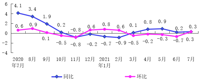 8月10日,记者从国家统计局四川调查总队获悉,2021年7月份,四川居民消费价格同比上涨0.3%,涨幅较上月扩大0.1个百分点。其中,城市上涨0.5%,农村持平;食品价格下降7.4%,非食品价格上涨2.2%;消费品价格下降0.9%,服务价格上涨2.2%。