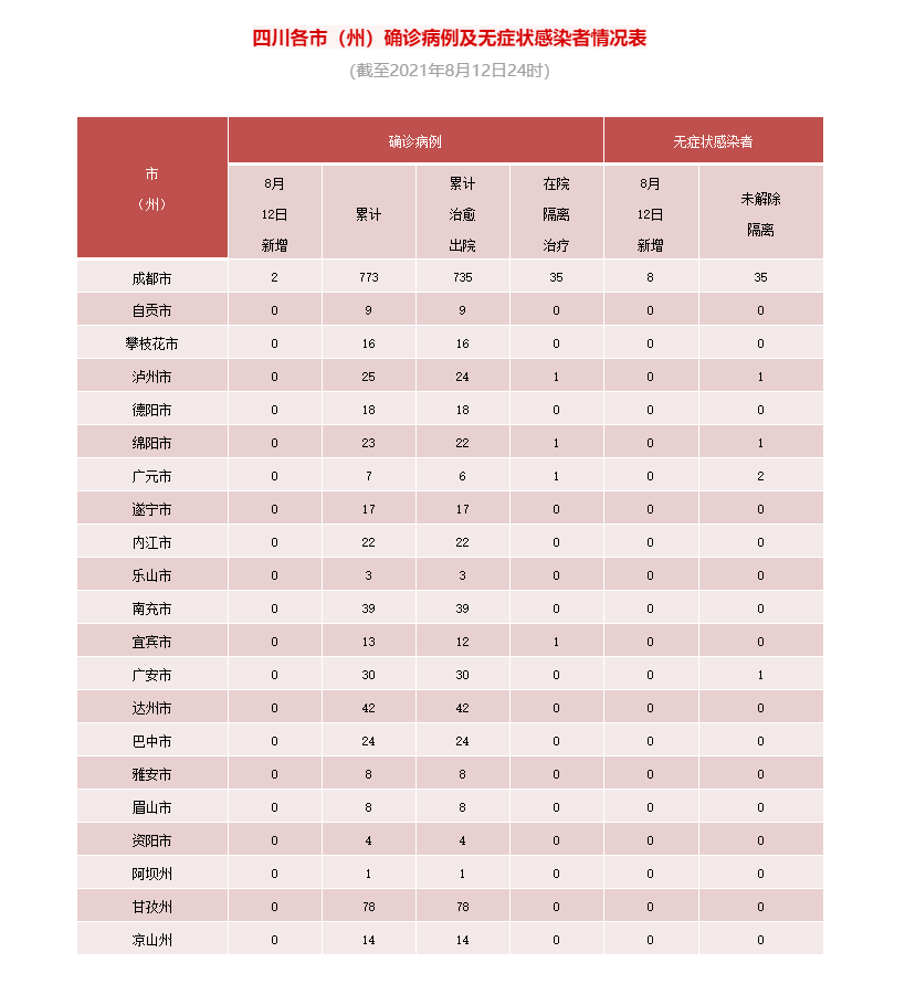 8月12日0-24时,四川新增新型冠状病毒肺炎确诊病例2例(境外输入,均为8月11日无症状感染者转确诊)。新增治愈出院病例1例,无新增疑似病例,无新增死亡病例。